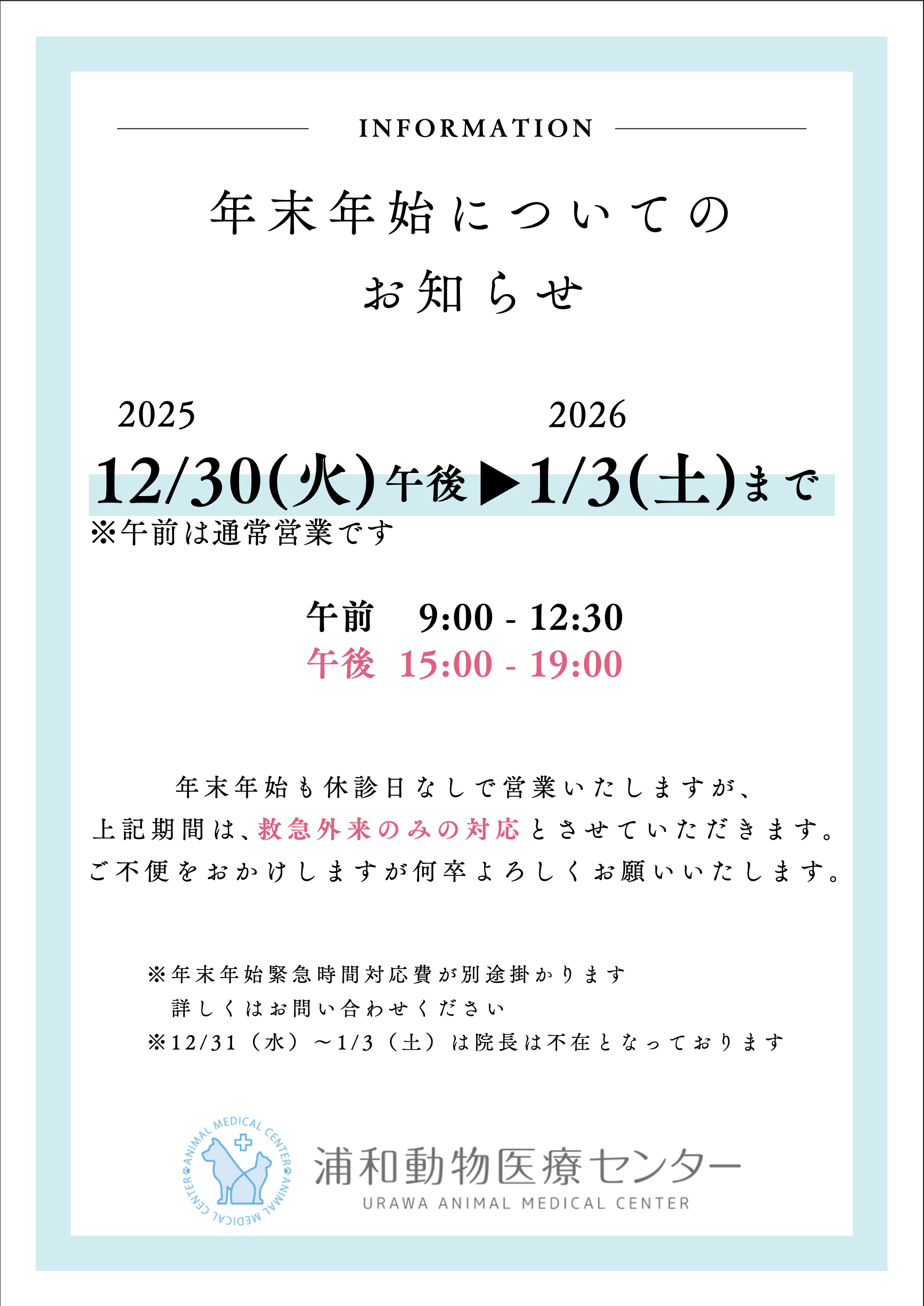 12/30の午後から1/3までは救急外来のみの受付となりますので、詳しくは下記のお知らせをご覧ください。